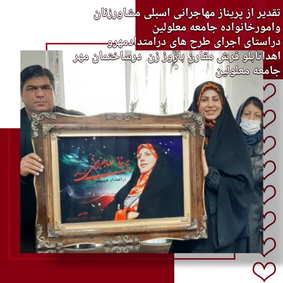 تقدیرازپرینازمهاجرانی اسبلی مشاورزنان وامورخانواده جامعه معلولین درراستای اجرای طرح های درامتدادمهر واهداتابلو فرش مقارن باروززن درساختمان مهر جامعه معلولین